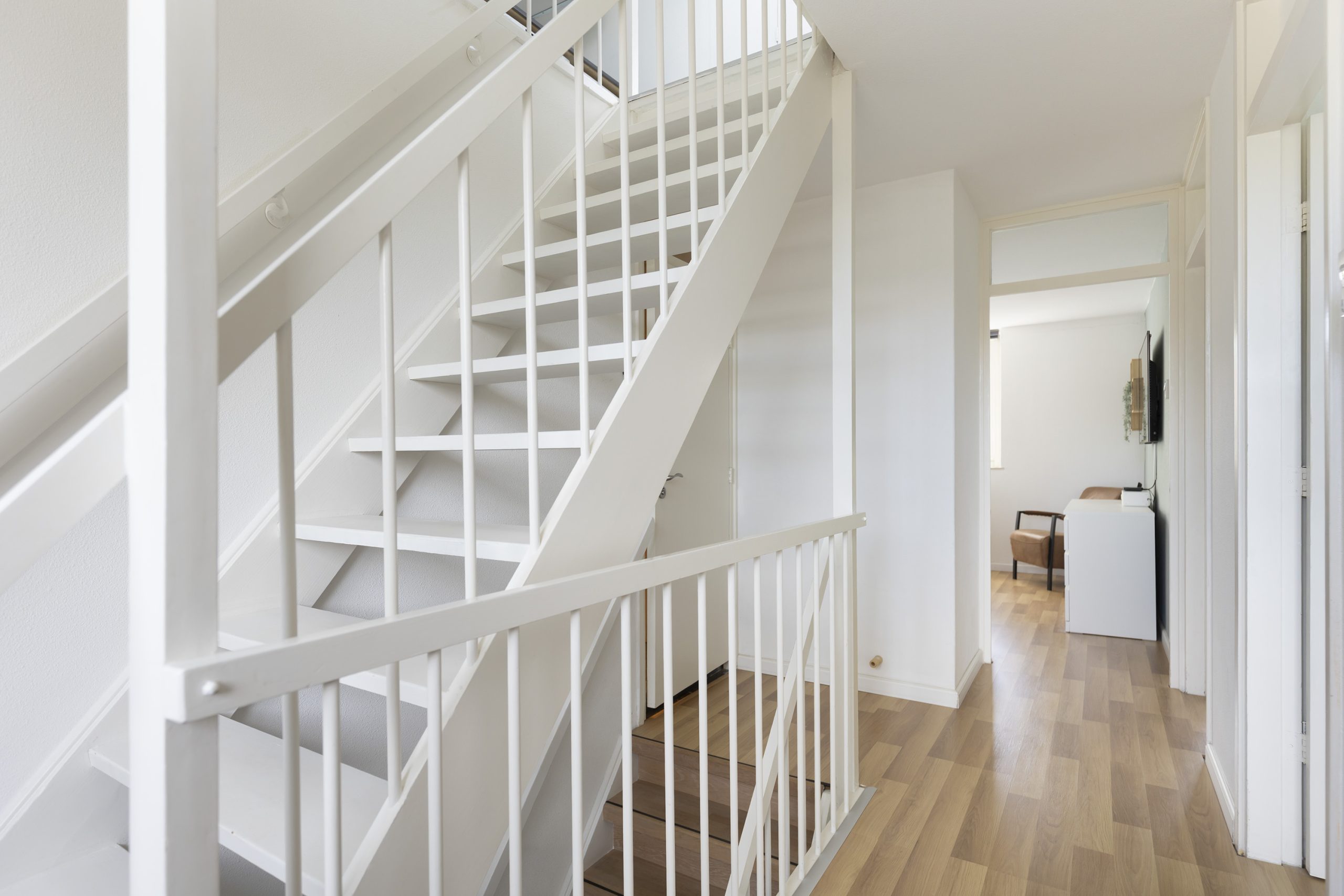 Via de vaste trap bereikt u de ruime overloop met aansluitingen voor de wasmachine en droger. Hier bevindt zich ook de cv-installatie en extra bergruimte. De vierde slaapkamer is royaal en dankzij meerdere dakramen bijzonder licht. De afgetimmerde schuine kanten bieden praktische extra opbergmogelijkheden.