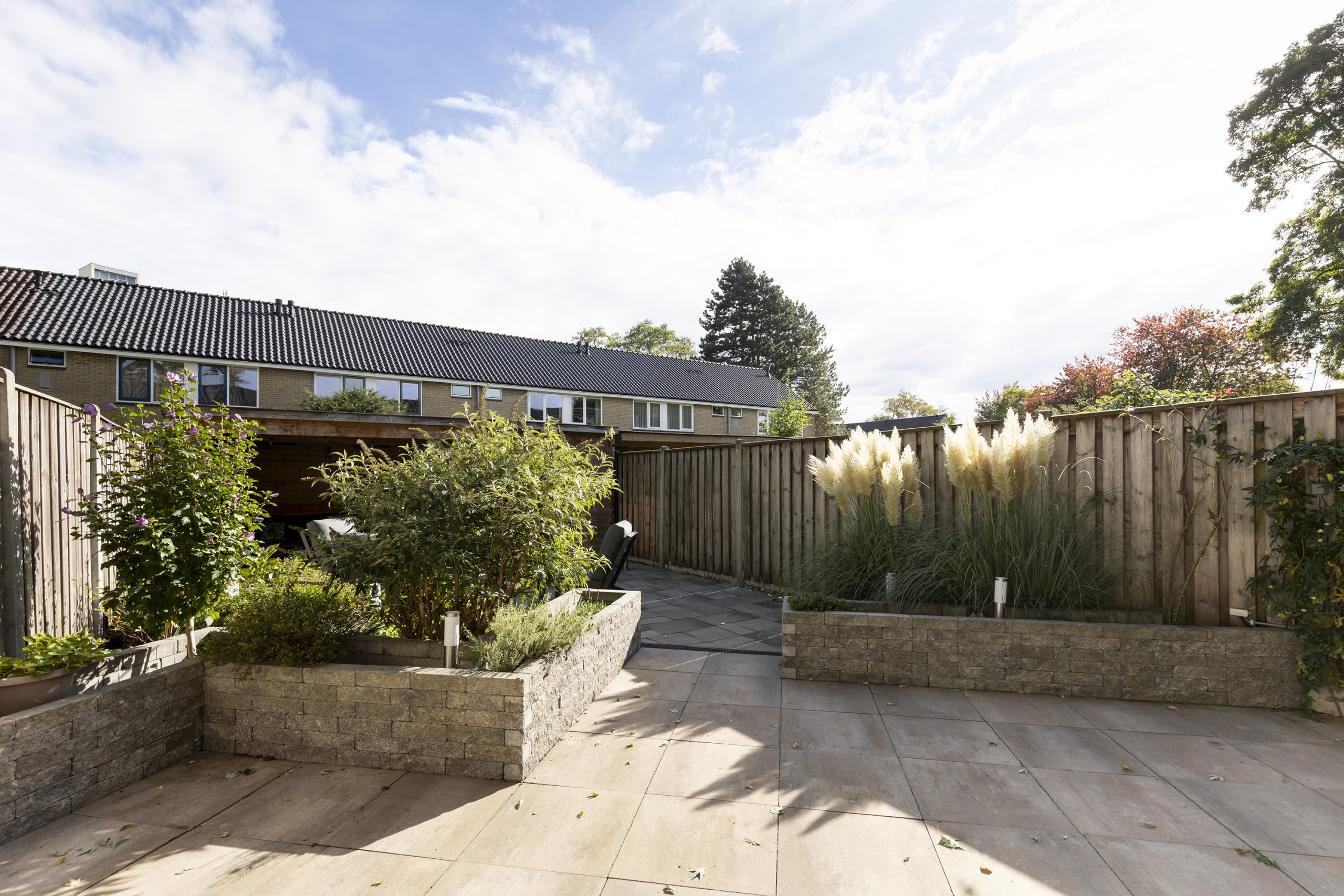 De fraai aangelegde en verrassend diepe achtertuin ligt ideaal op het zuidoosten, waardoor u ook na werktijd van de zon kunt genieten. De tuin beschikt over een fraaie overkapping en een extra berging, ideaal voor fietsen of tuingereedschap.