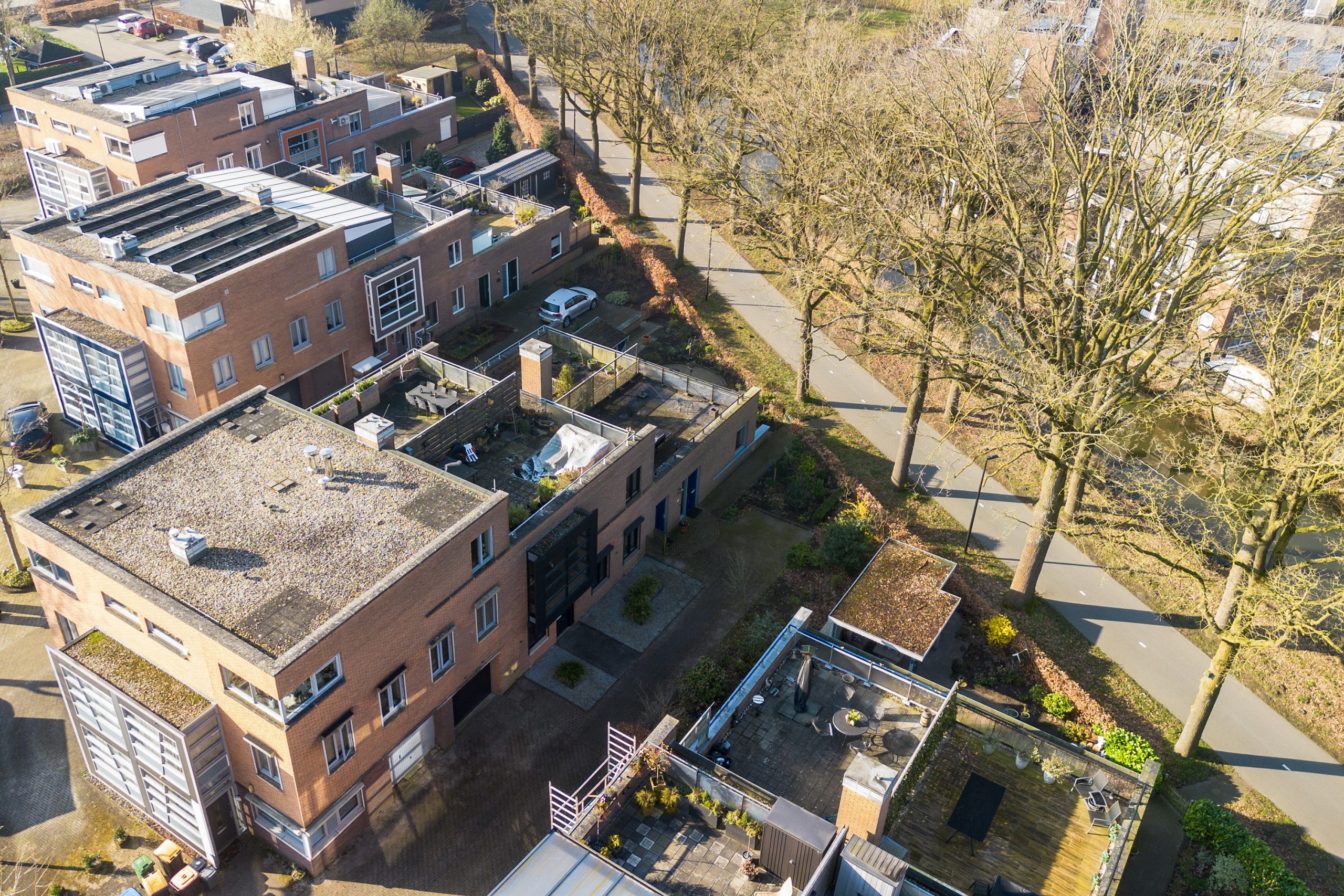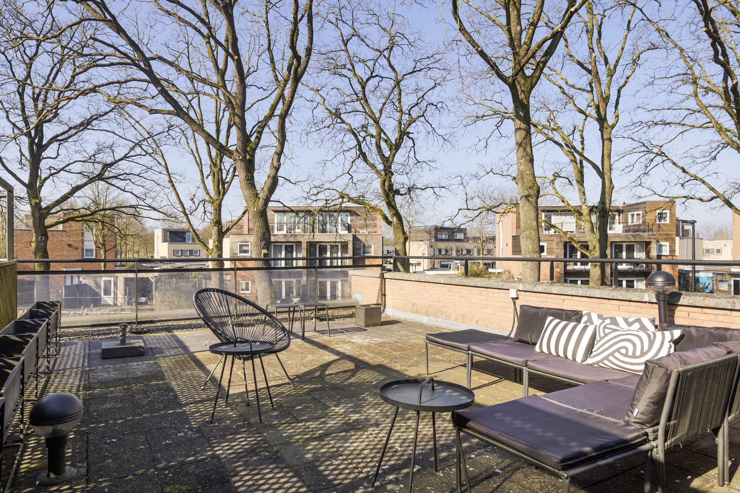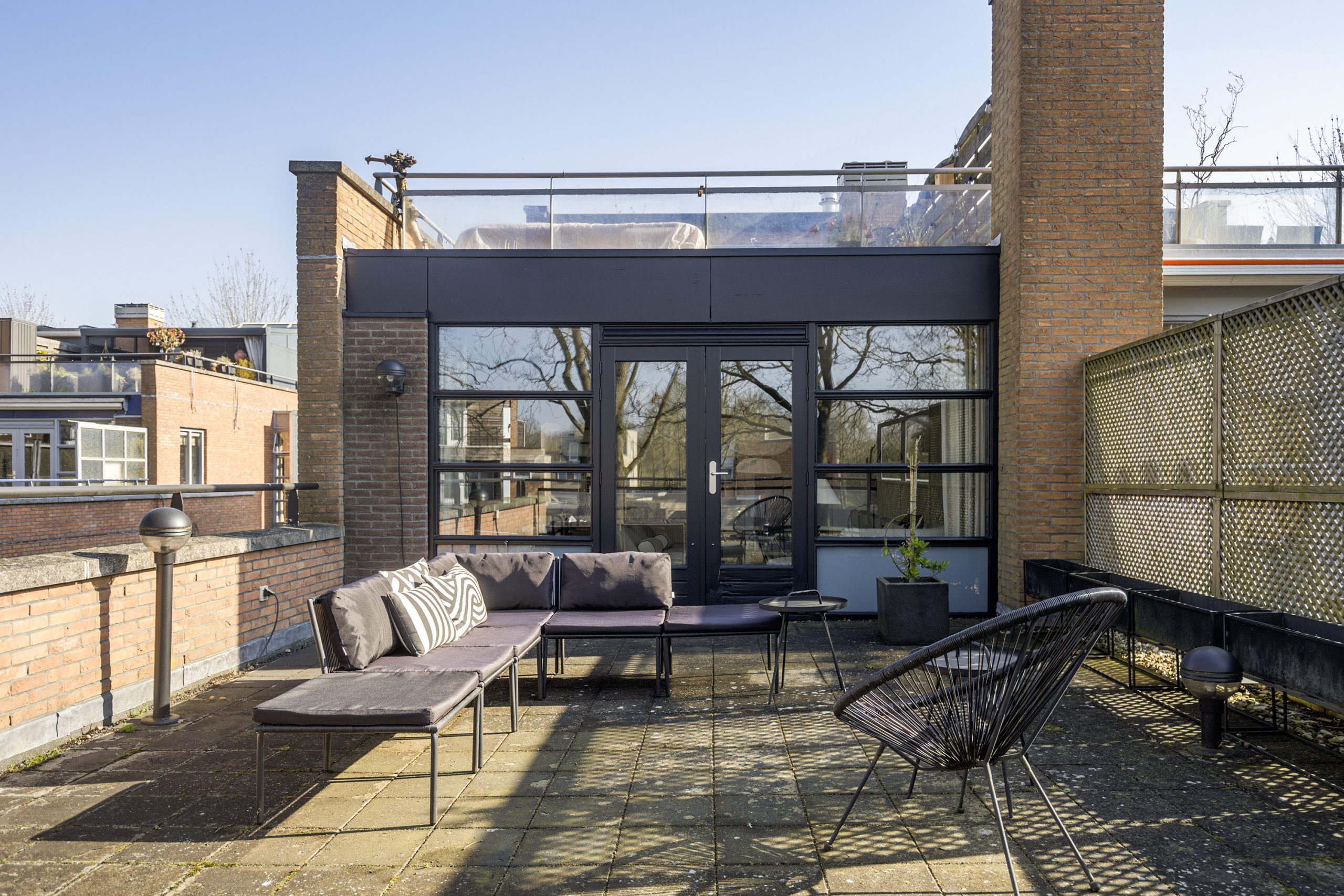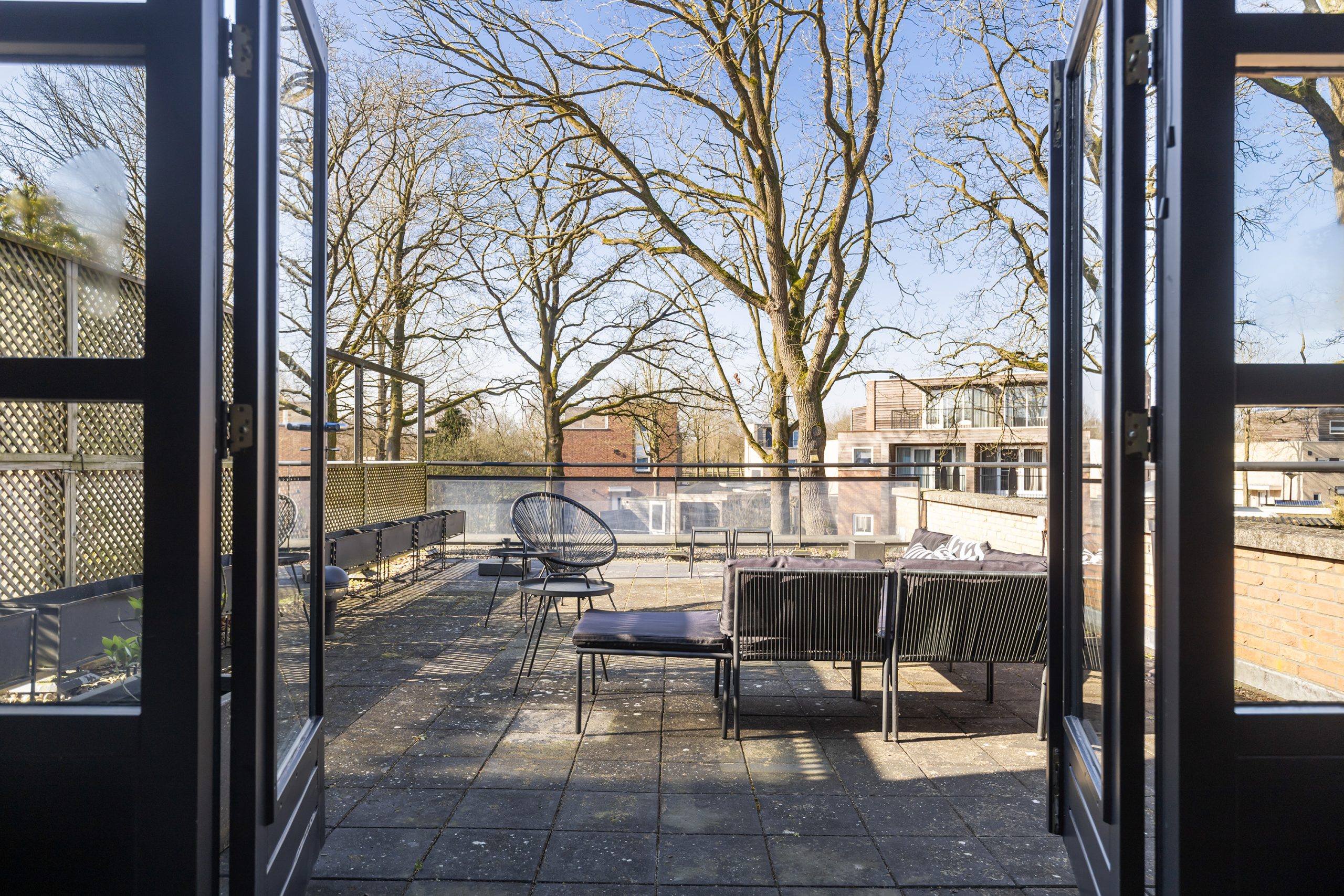 Vanuit de woonkamer geven openslaande deuren toegang tot het royale dakterras, gelegen op het zuidwesten. Hier kun je in alle rust en privacy optimaal genieten van de zon.