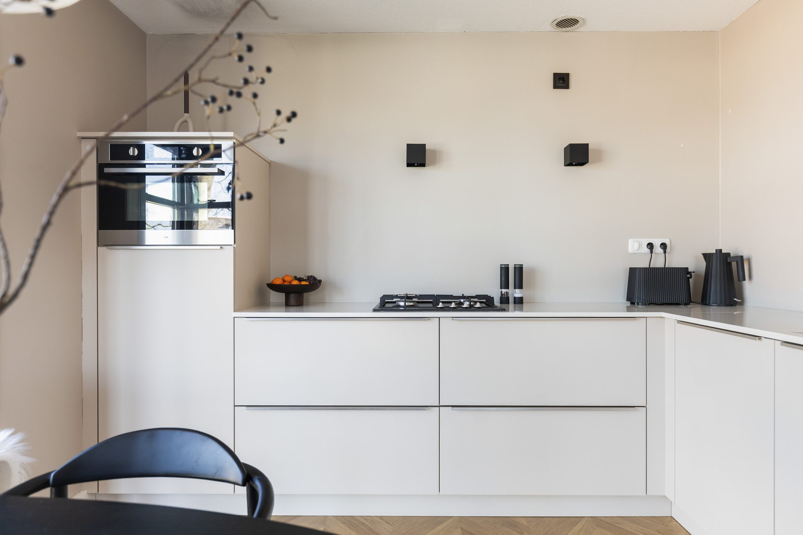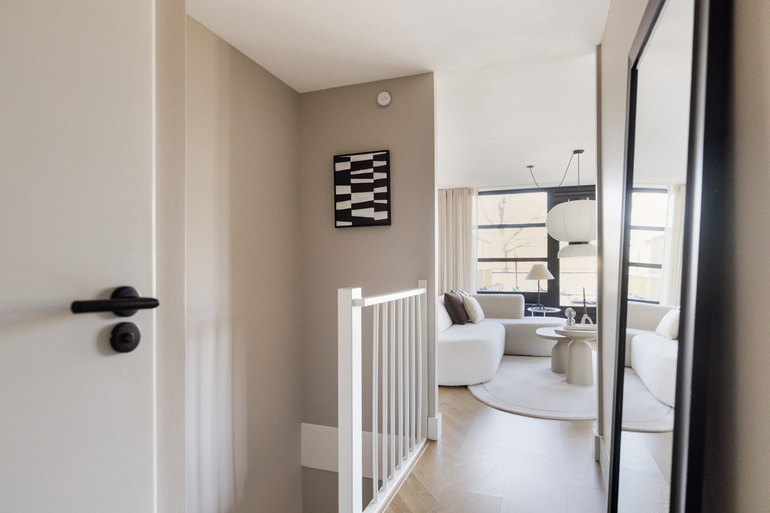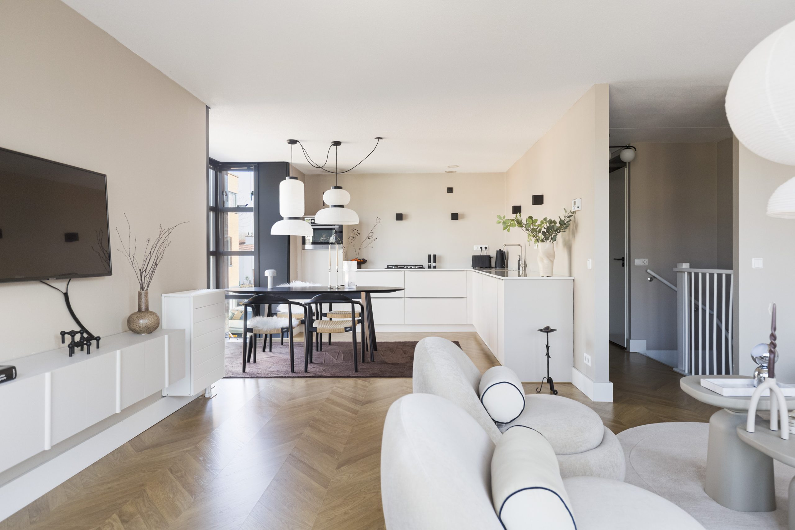 Via de trap bereik je de woonverdieping. De lichte woonkamer wordt gekenmerkt door grote raampartijen, die zorgen voor een prettige en ruime sfeer. Op deze verdieping bevindt zich tevens de moderne keuken, voorzien van diverse inbouwapparatuur. Dankzij de grote raampartijen geniet ook de keuken van een prachtige lichtinval en is er ruimte voor een gezellige eethoek.