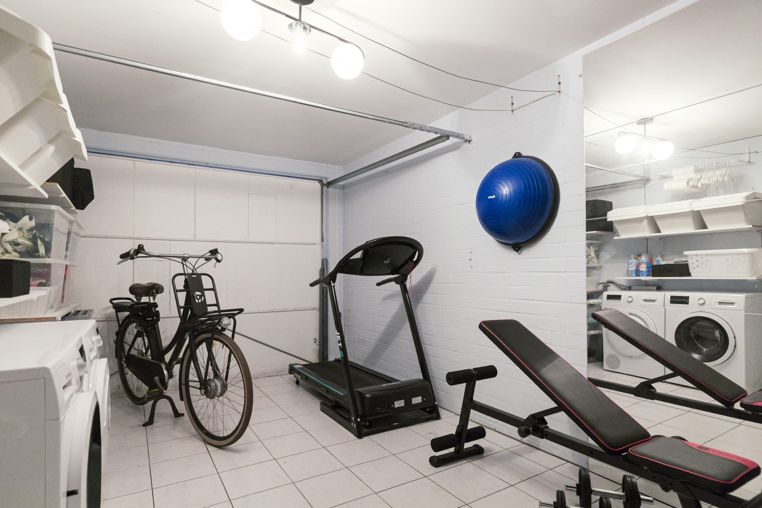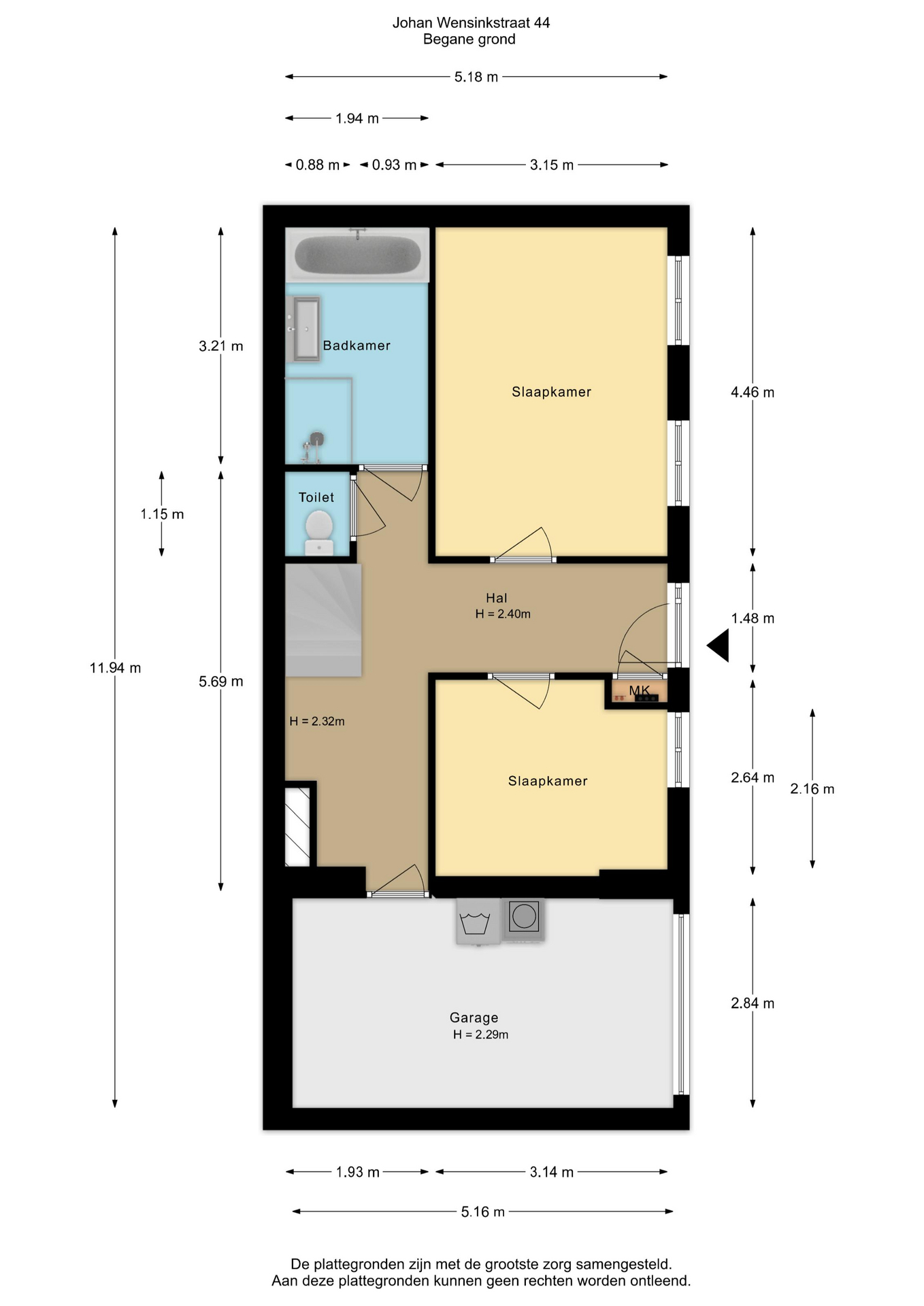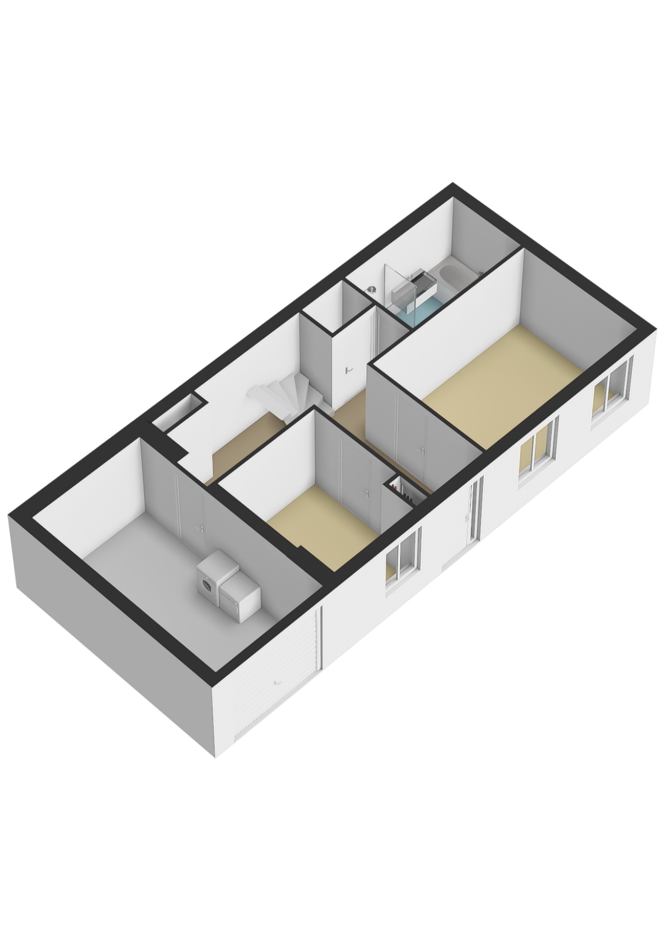 Bij binnenkomst op de begane grond betreed je de hal, waar zich aan beide zijden een slaapkamer bevindt. Vanuit de hal is aan de linkerzijde de inpandige garage bereikbaar, waar tevens de aansluiting voor de wasmachine aanwezig is. Aan de rechterzijde vind je een separaat toilet en daarnaast de badkamer, voorzien van een ligbad, douche en wastafel.