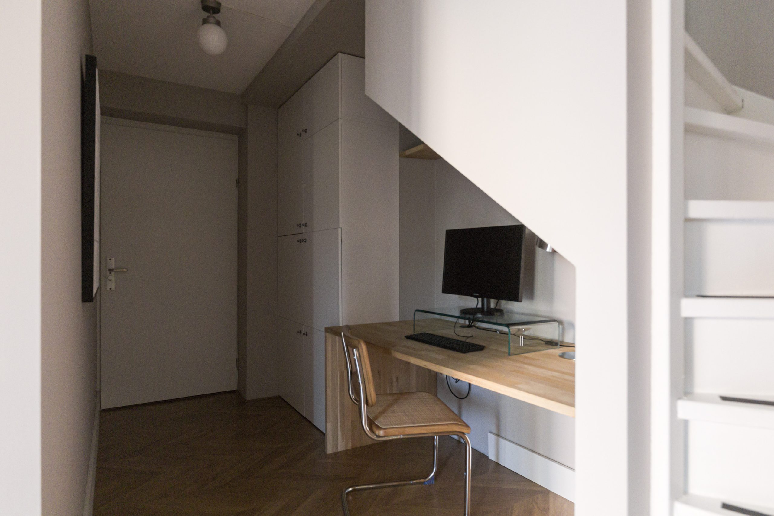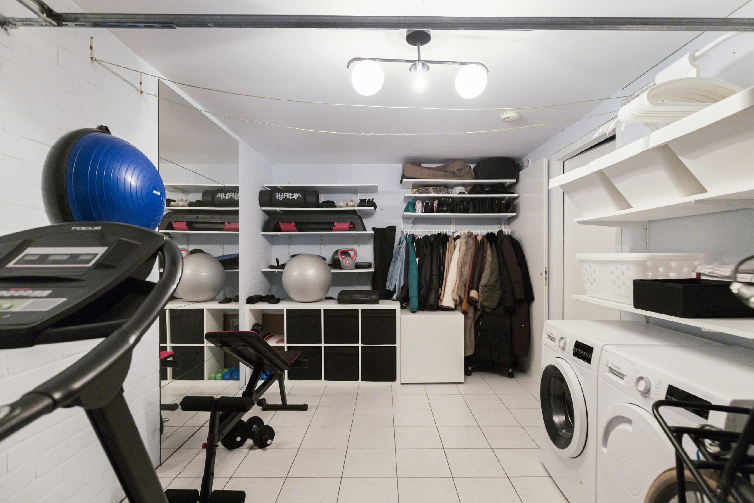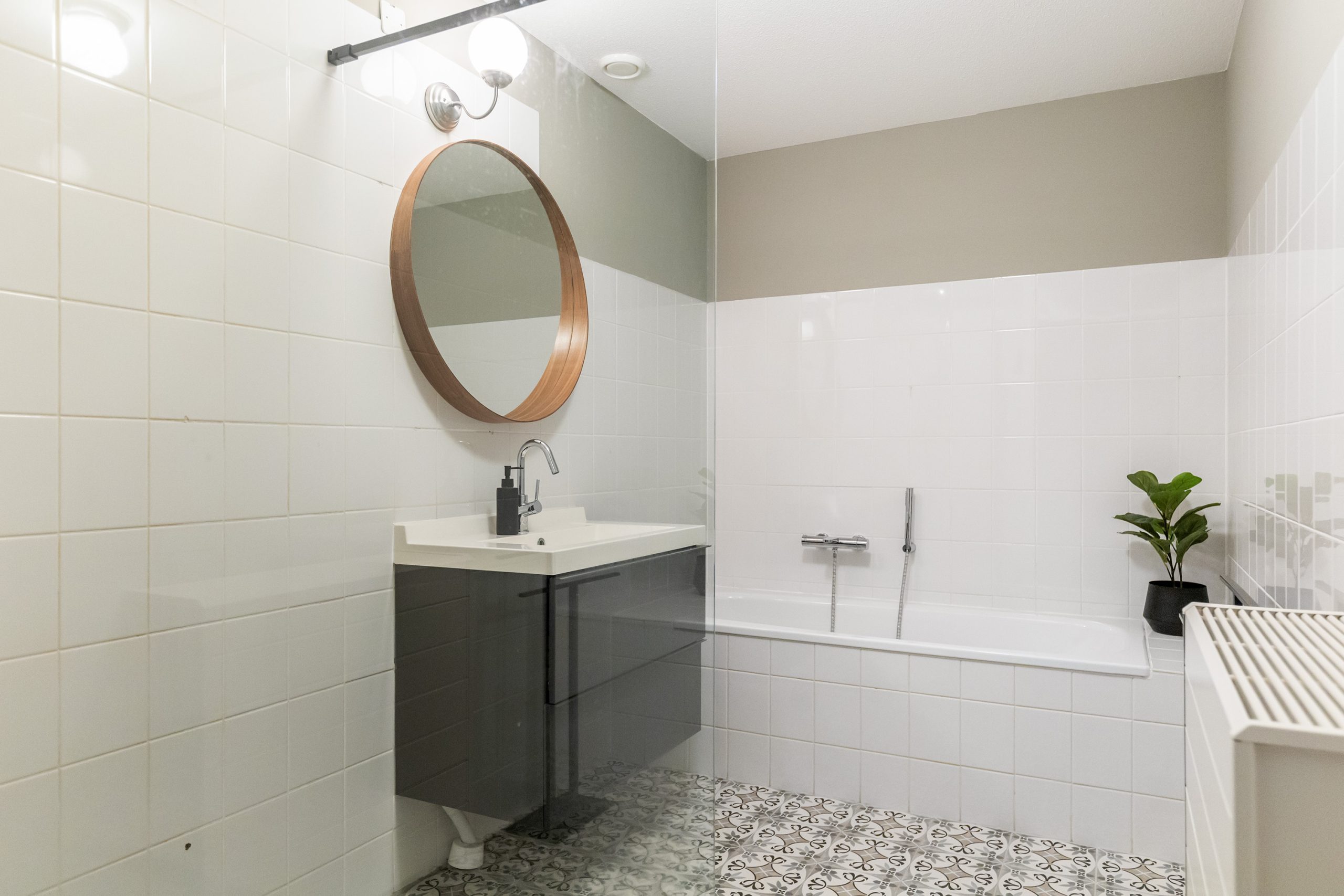 Bij binnenkomst op de begane grond betreed je de hal, waar zich aan beide zijden een slaapkamer bevindt. Vanuit de hal is aan de linkerzijde de inpandige garage bereikbaar, waar tevens de aansluiting voor de wasmachine aanwezig is. Aan de rechterzijde vind je een separaat toilet en daarnaast de badkamer, voorzien van een ligbad, douche en wastafel.