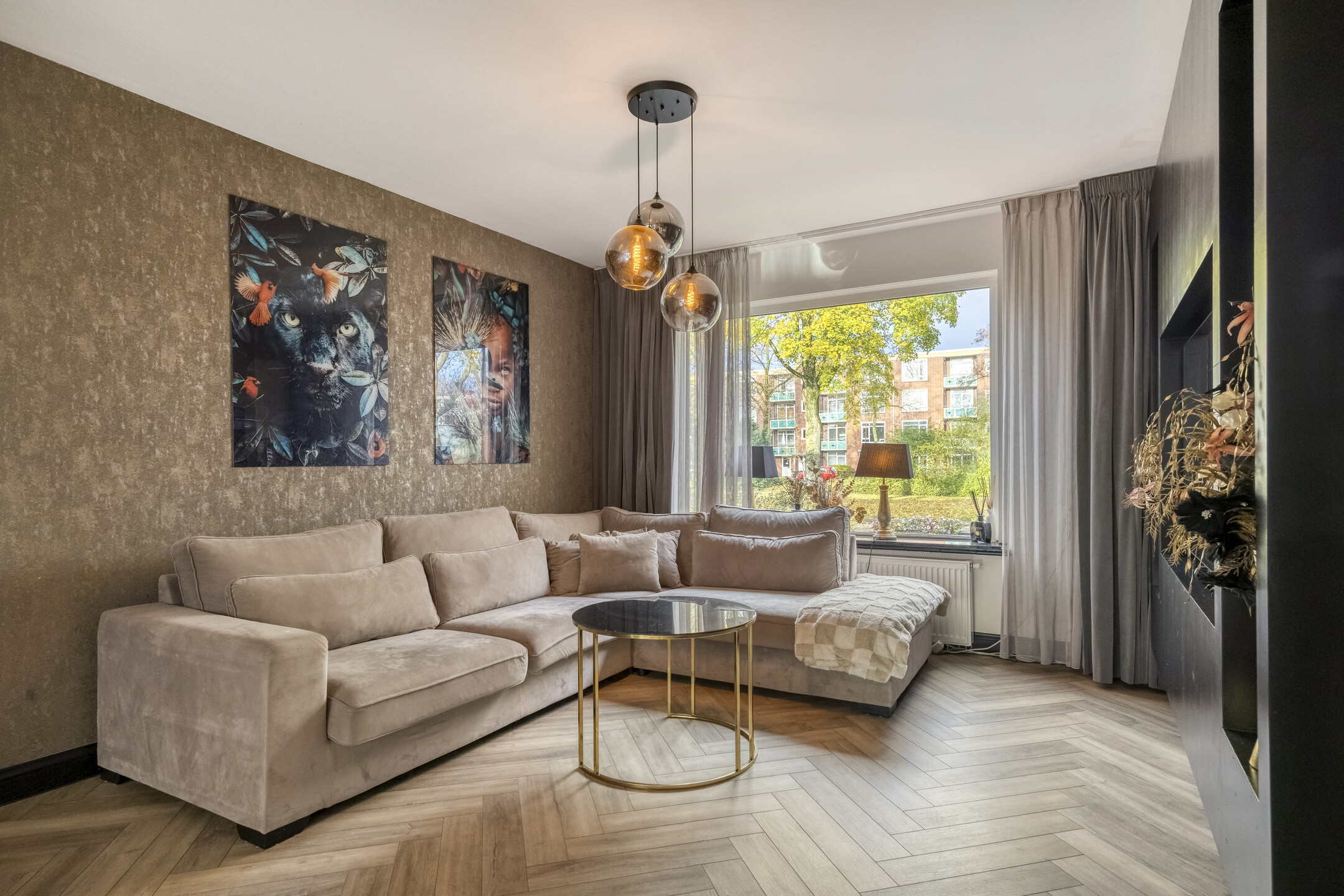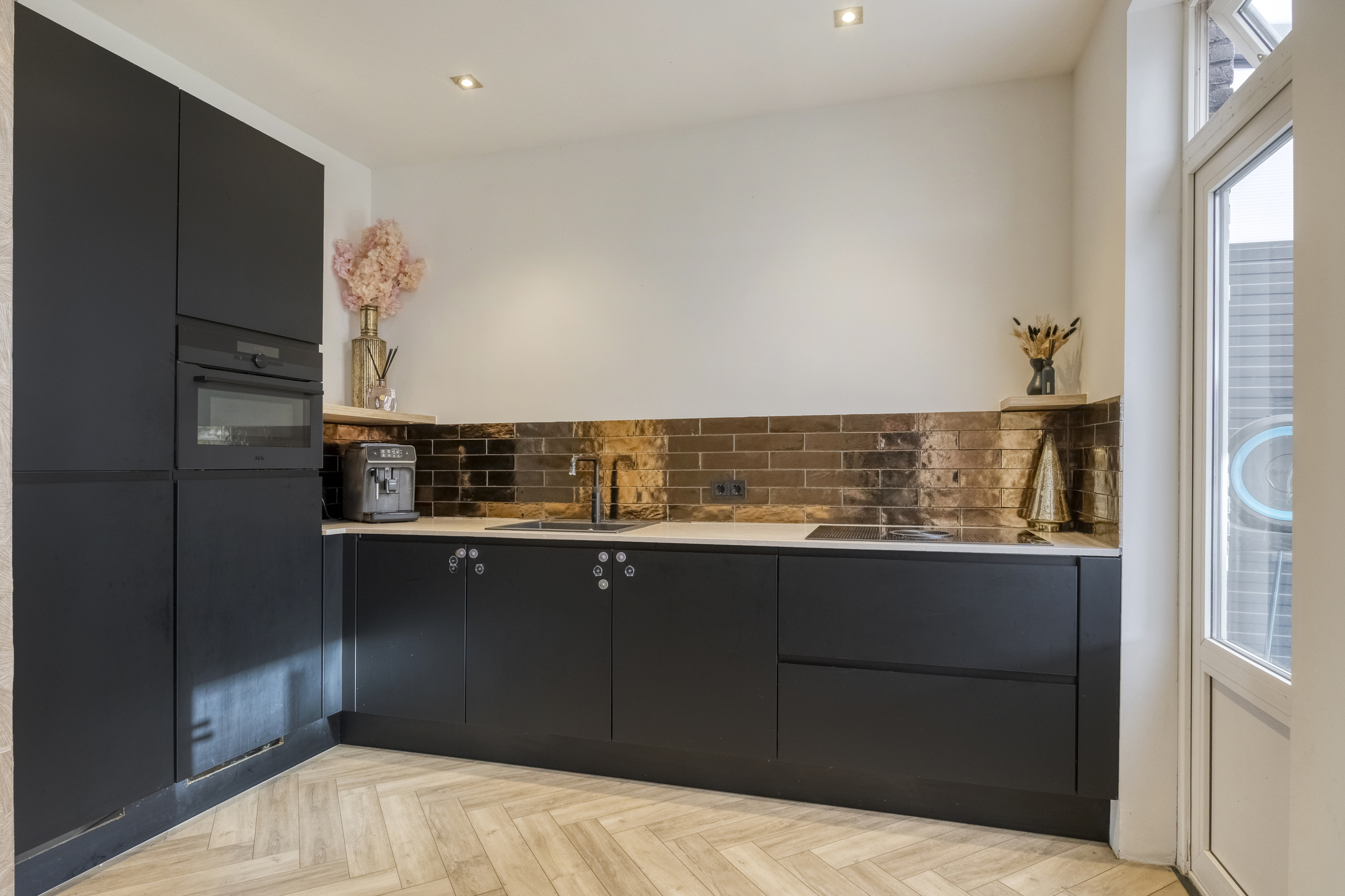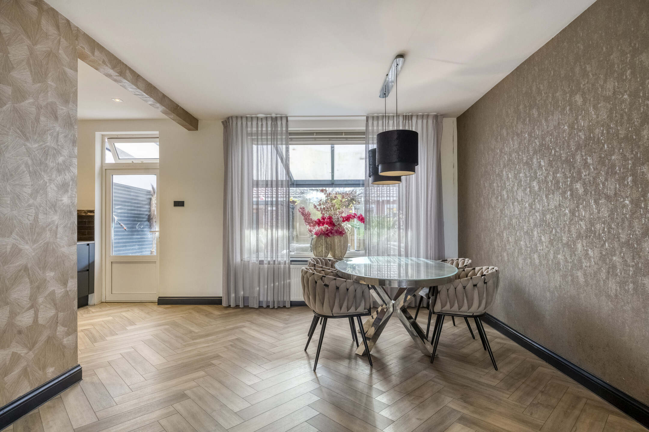 Entree in de hal met toegang tot het toilet, de kelder en de woonkamer. De lichte en zonnige doorzonkamer is voorzien van een moderne pvc-visgraatvloer. Aan de achterzijde is ruimte voor een grote eettafel en bevindt zich de moderne open keuken in hoekopstelling, uitgerust met een inductiekookplaat, vaatwasser, koelkast en diepvries. Vanuit de keuken is er een deur naar de tuin.