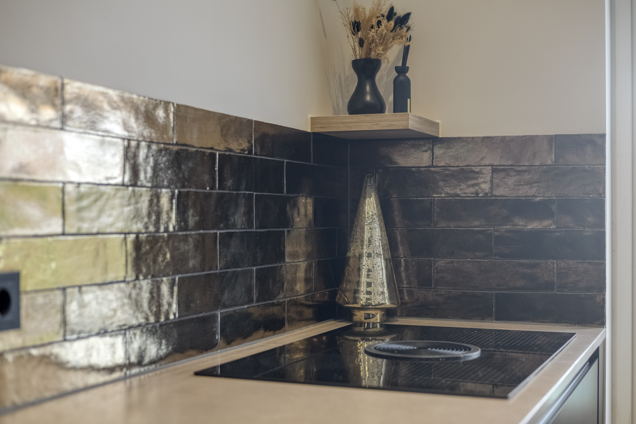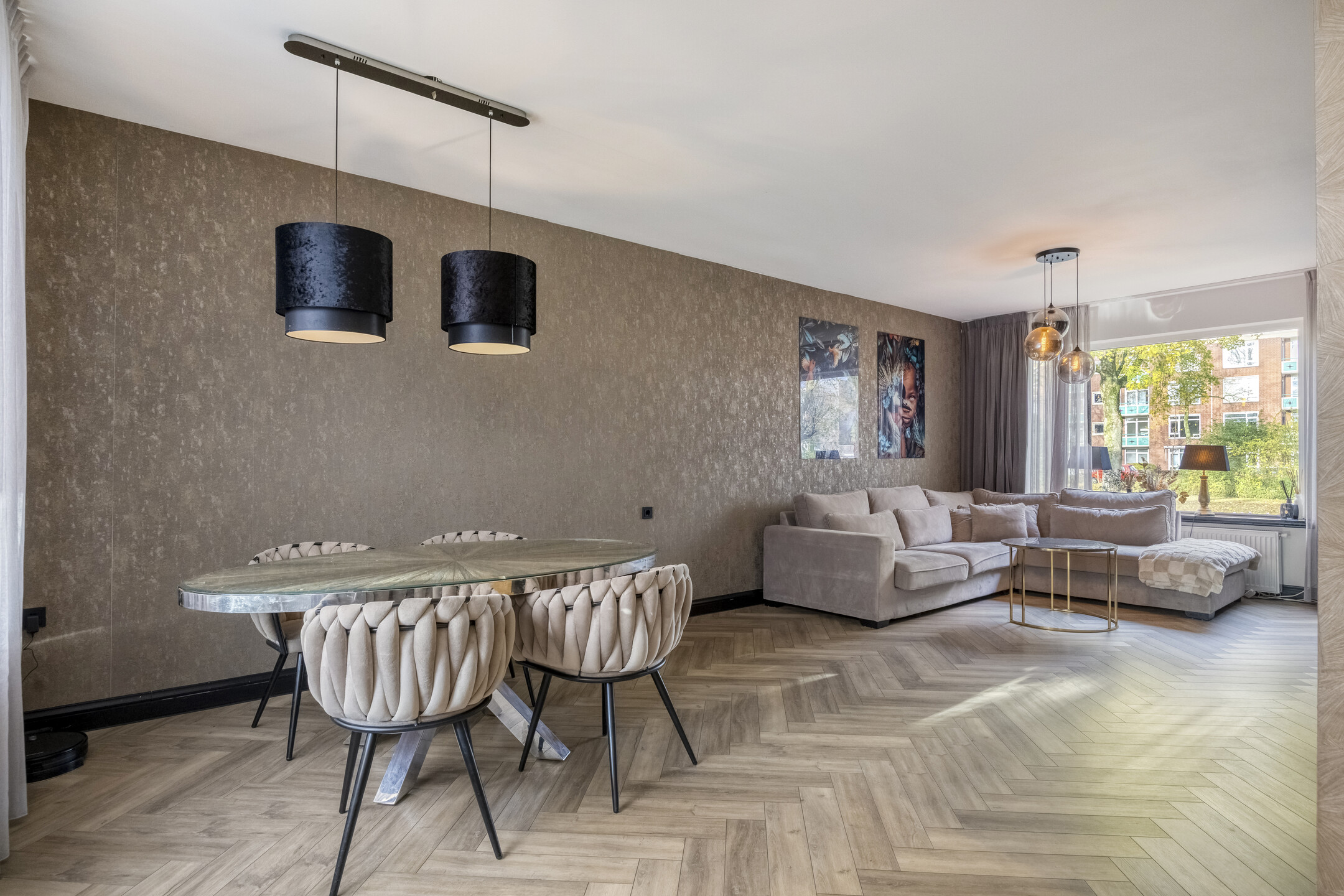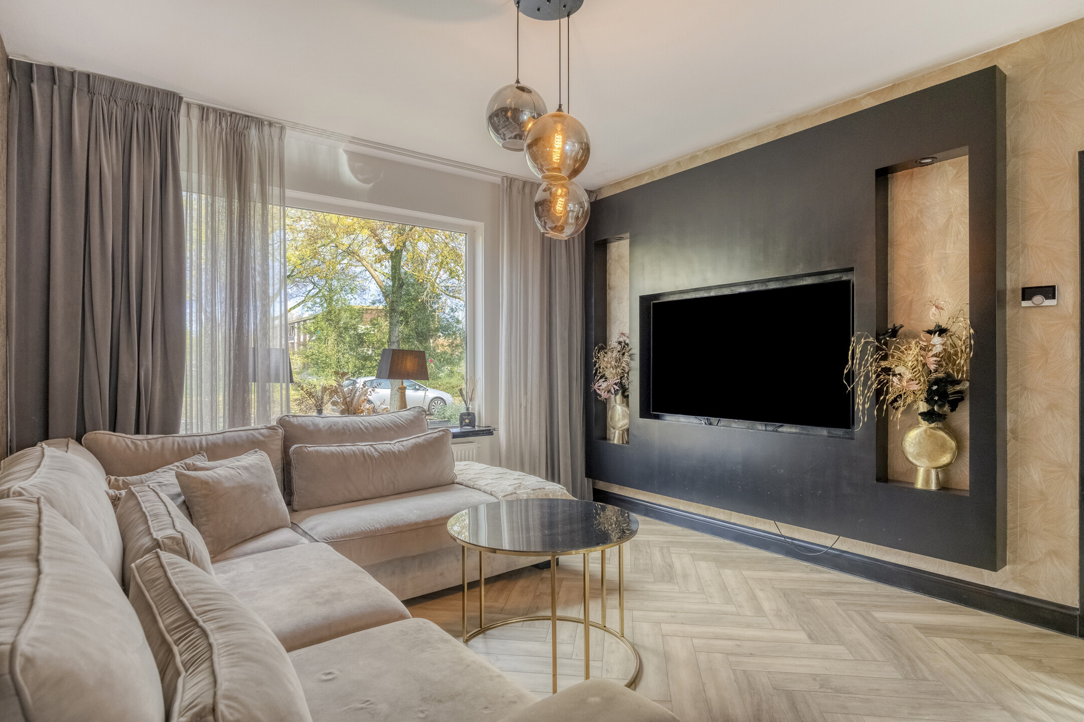 Entree in de hal met toegang tot het toilet, de kelder en de woonkamer. De lichte en zonnige doorzonkamer is voorzien van een moderne pvc-visgraatvloer. Aan de achterzijde is ruimte voor een grote eettafel en bevindt zich de moderne open keuken in hoekopstelling, uitgerust met een inductiekookplaat, vaatwasser, koelkast en diepvries. Vanuit de keuken is er een deur naar de tuin.