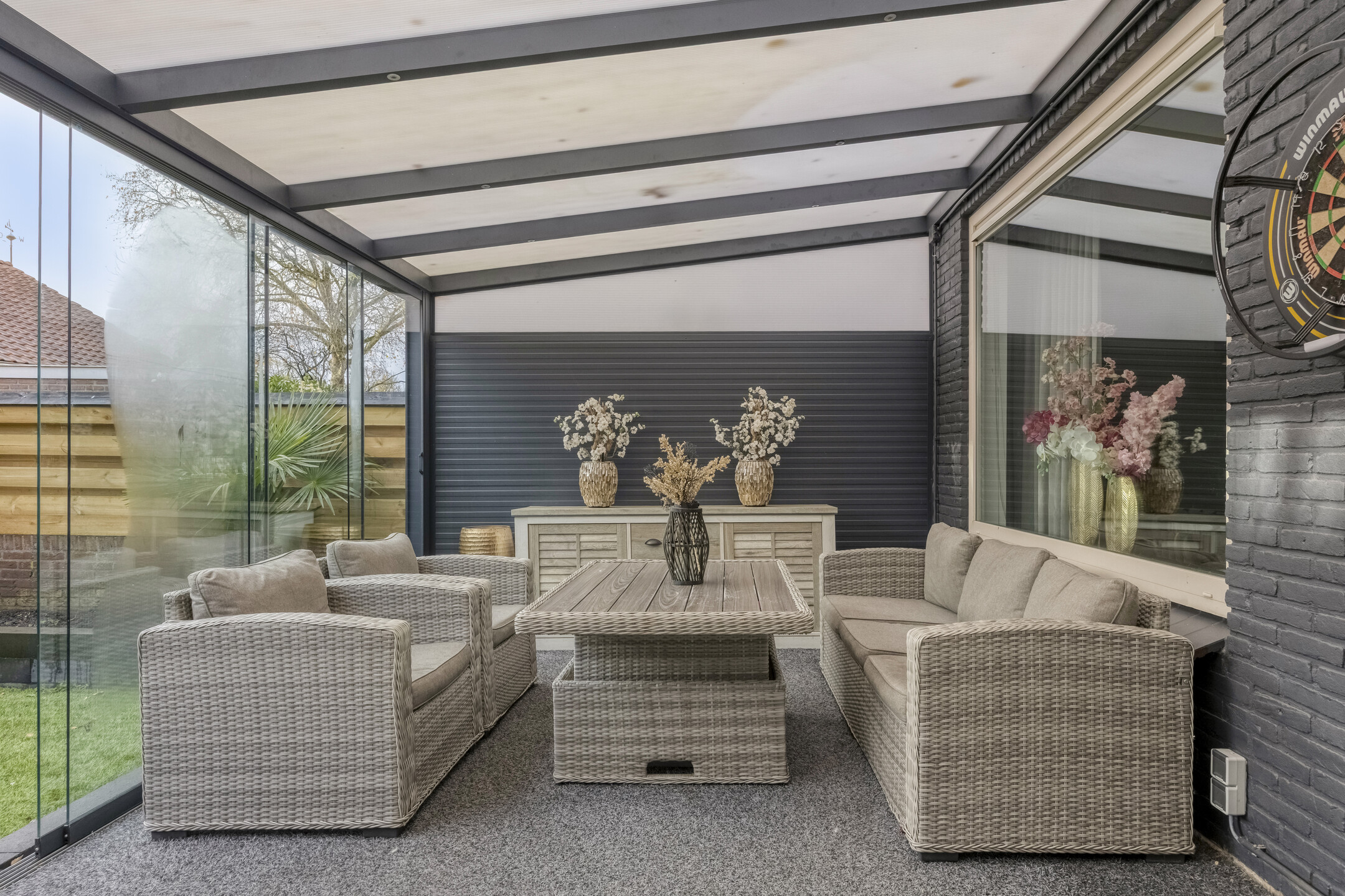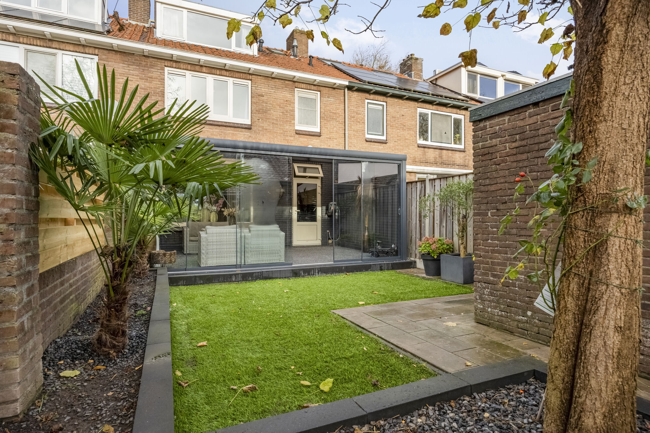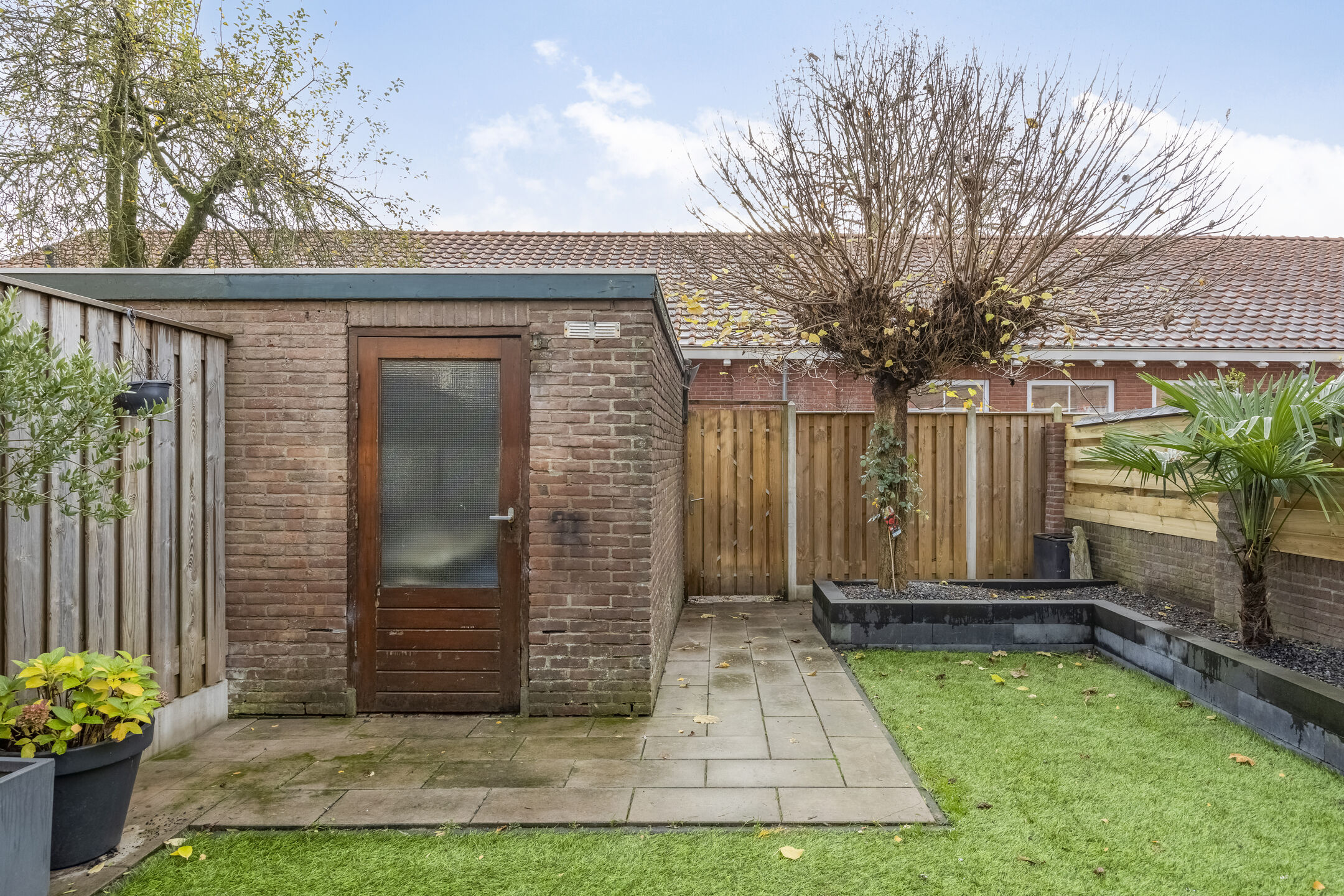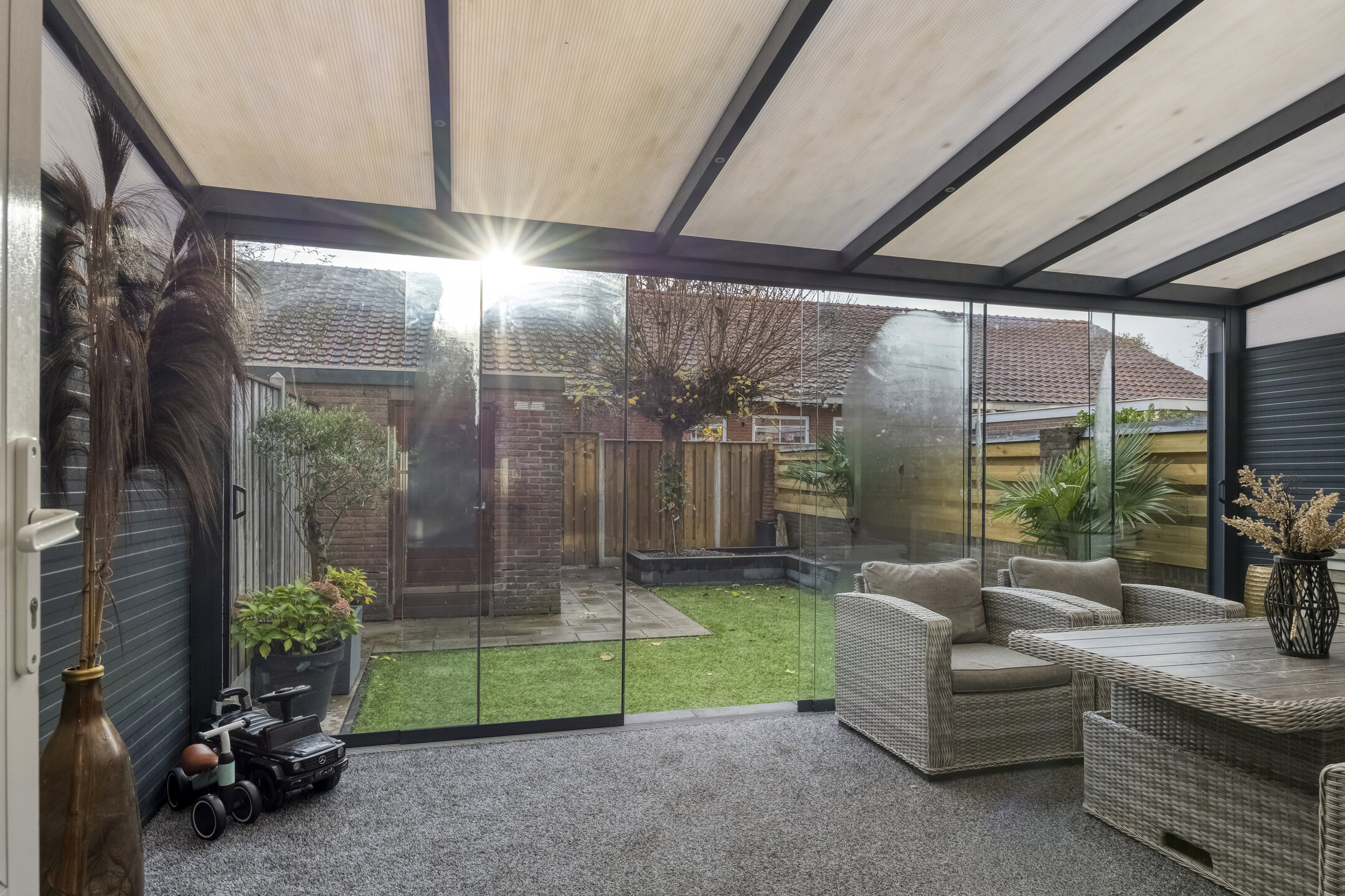 De tuin is vanuit de keuken bereikbaar en beschikt direct aan het huis over een sfeervolle, afsluitbare serre met glazen wanden, waardoor je hier het hele jaar door kunt genieten van de buitenruimte. De tuin is onderhoudsvriendelijk aangelegd met kunstgras en biedt voldoende plaats om gezellig buiten te zitten. Achterin staat een vrijstaande stenen berging, ideaal voor het stallen van fietsen en het opbergen van spullen. Daarnaast is er een praktische achterom aanwezig.