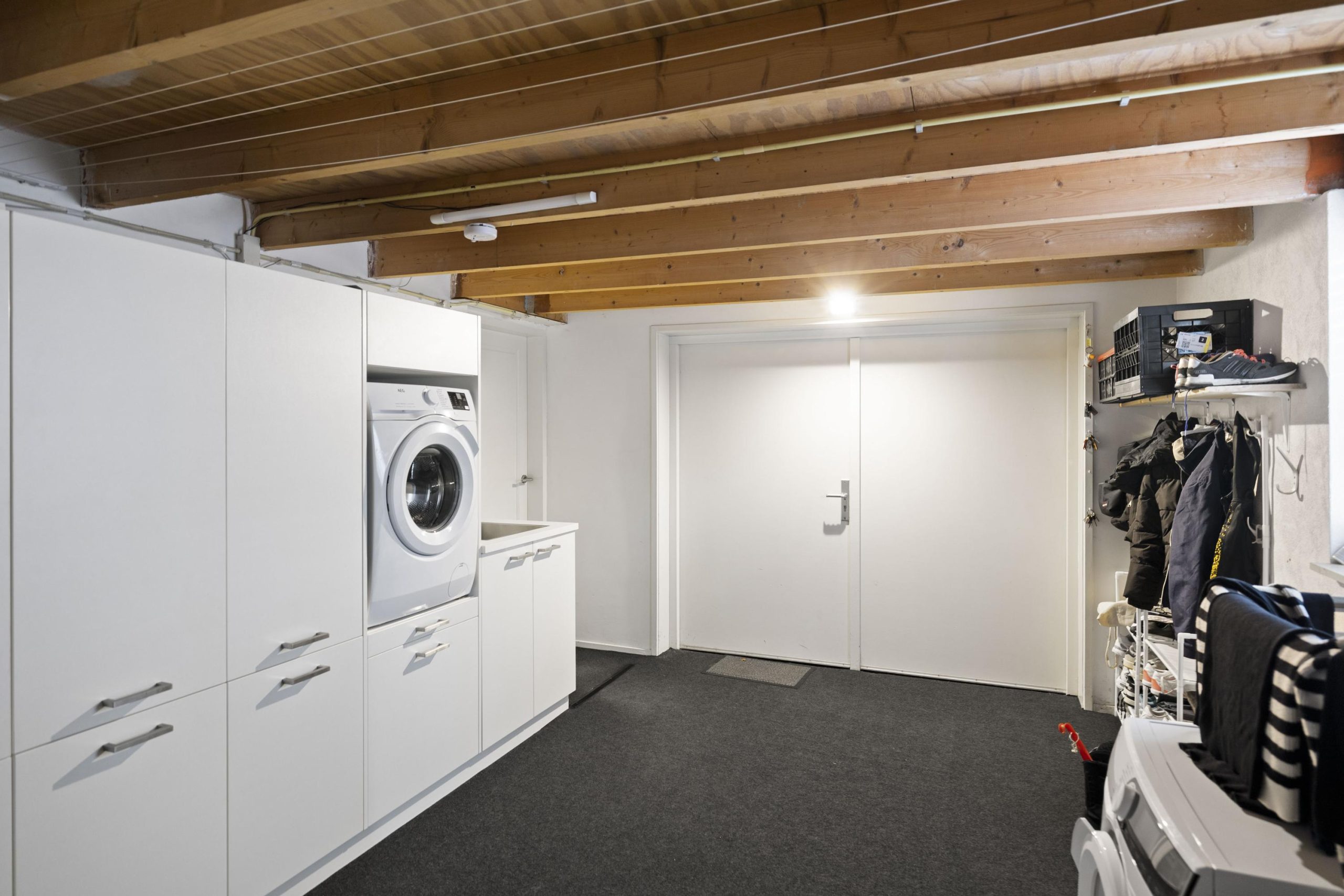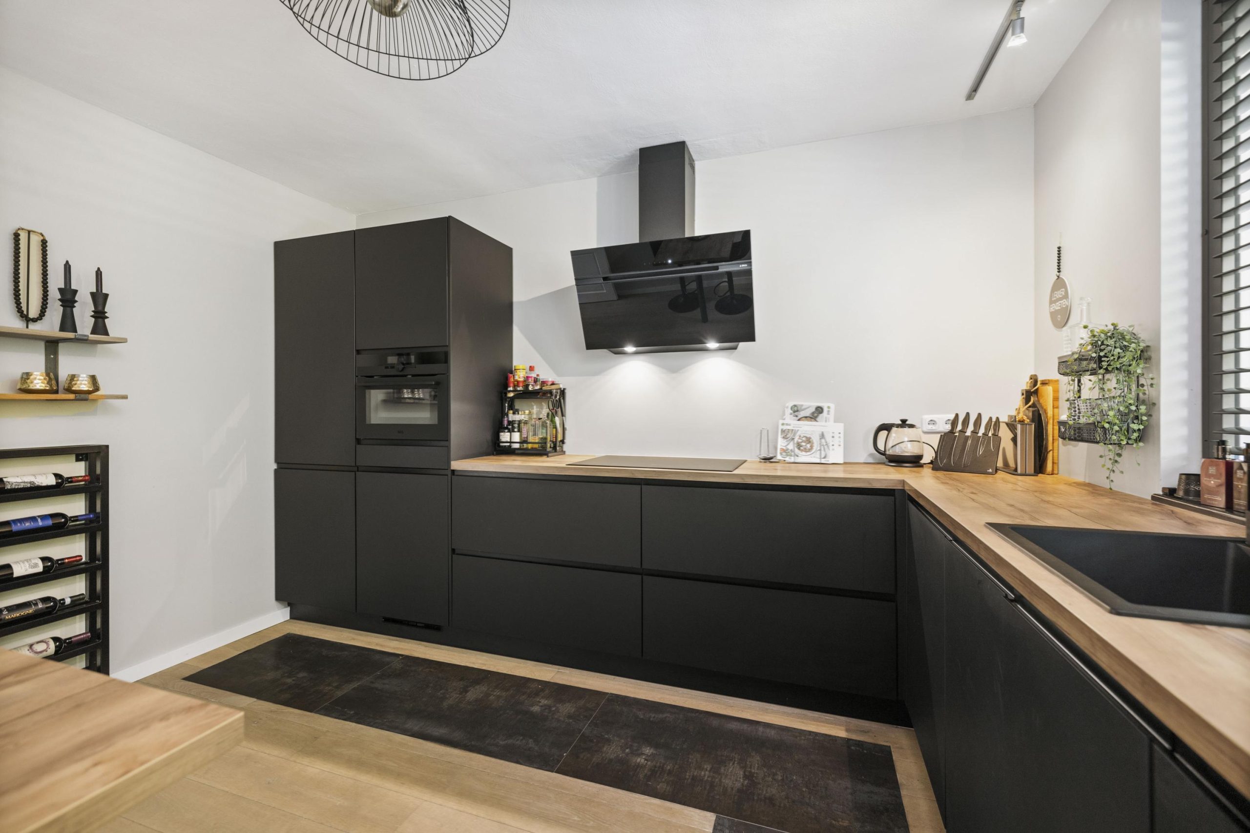 De woning beschikt over een luxe keuken met houten werkblad en moderne inbouwapparatuur, waaronder een 5-pits kookplaat, brede oven, combimagnetron, vaatwasser en koelkast. Daarnaast vindt u op de begane grond een kantoor- of slaapkamer en is de garage binnendoor bereikbaar.