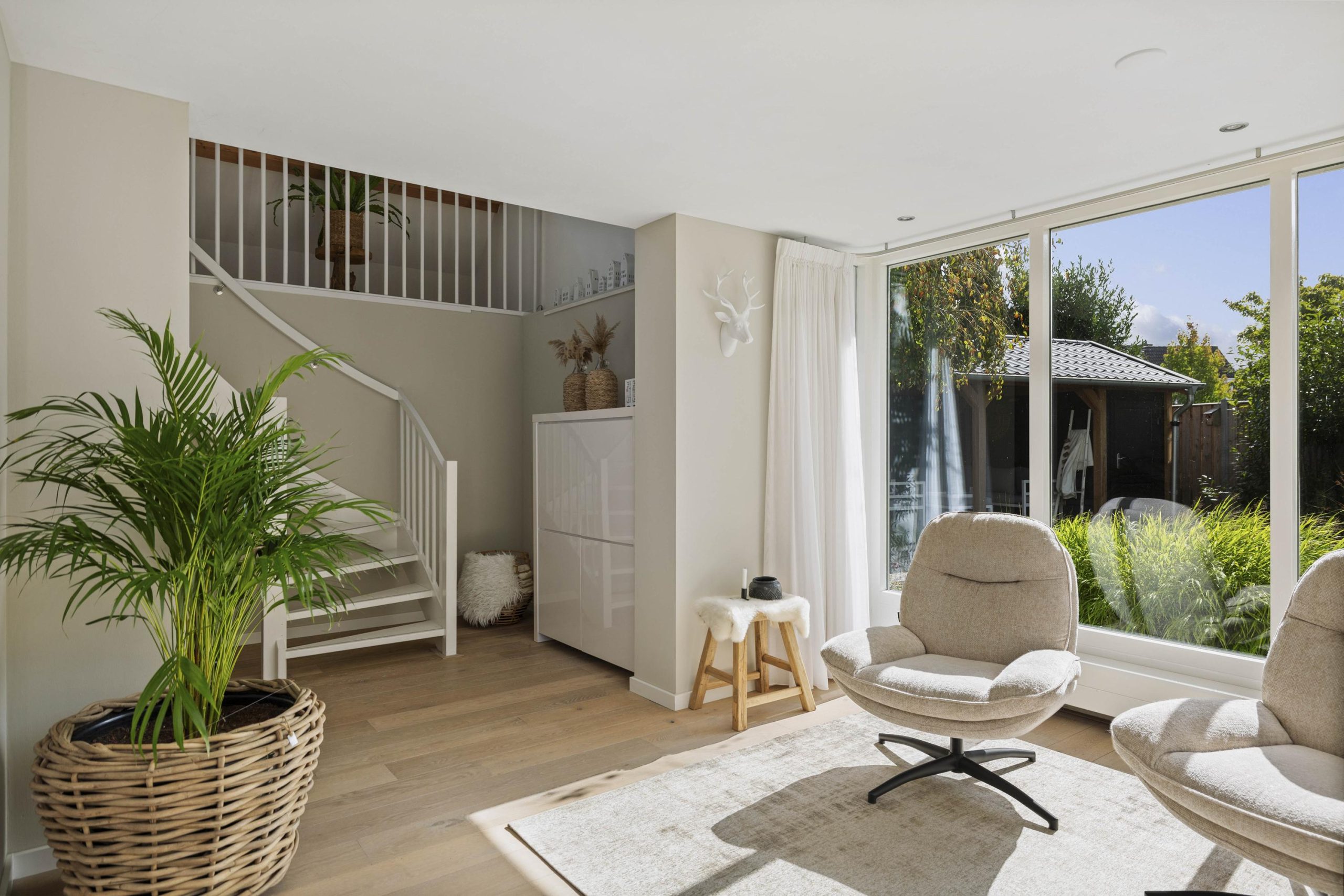 Bij binnenkomst komt u in de hal met garderobe, meterkast en toilet. De royale woonkamer is heerlijk licht en voorzien van een serre met dubbele tuindeuren die uitzicht geven op de fraai aangelegde tuin. Vanuit de woonkamer bereikt u bovendien de vide boven de garage, waar een praktische werkkamer is ingericht.
