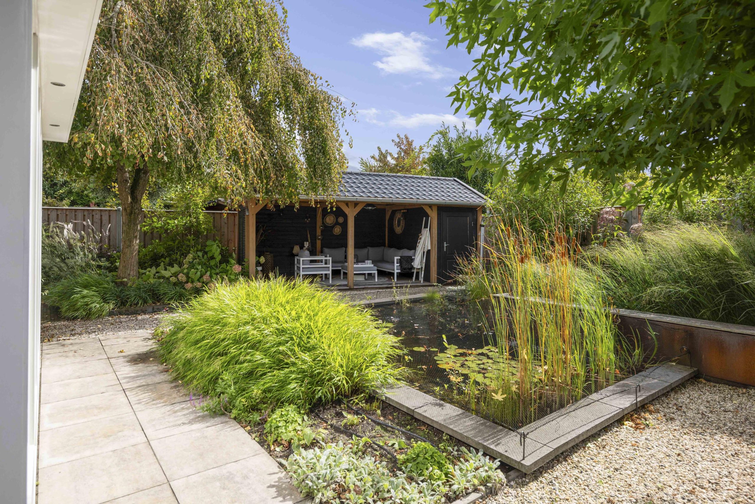 De woning wordt omringd door een fraai aangelegde tuin die veel privacy en sfeer biedt. Meerdere terrassen, verzorgde borders en een vijver maken het plaatje compleet. Onder de luxe terrasoverkapping geniet u in elk seizoen van het buitenleven. Voor extra comfort is de achterzijde van de woning voorzien van een elektrisch zonnescherm (Cubola) dat u eenvoudig via de Somfy-app kunt bedienen. Daarnaast is bij het zijraam van de eethoek een screen geplaatst. Zowel in de voor- als achtertuin ligt bovendien een druppelslang beregeningssysteem, dat met een computergestuurde kraan kan worden ingesteld – ideaal voor het onderhoud van de tuin.