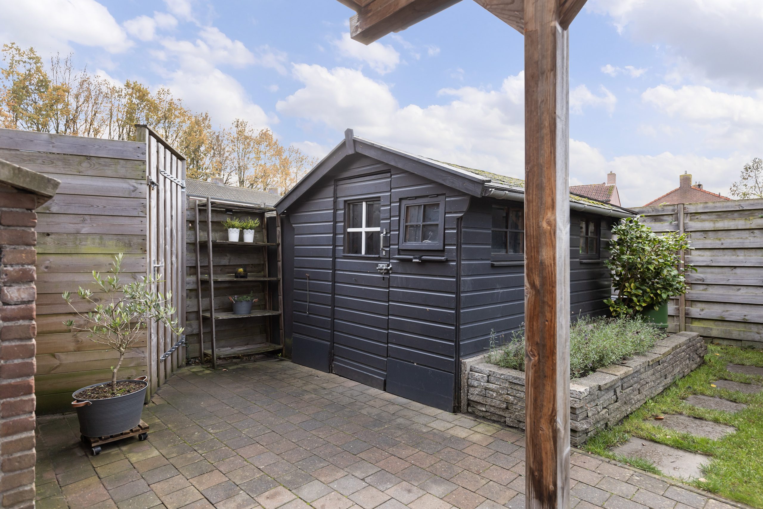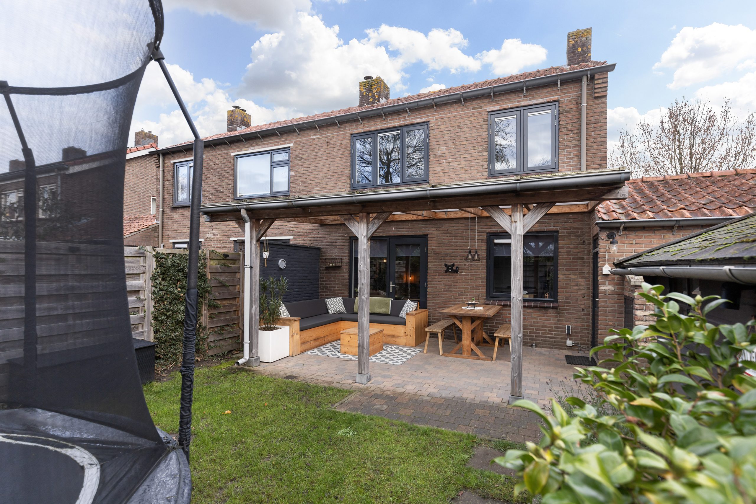 De achtertuin is praktisch ingedeeld en via de bijkeuken bereikbaar. De tuin beschikt over een achterom en tegen de achtergevel bevindt zich een overkapping, waar nu een gezellige loungehoek is gecreëerd. Achter in de tuin staat een vrijstaande houten berging. Dankzij de ligging op het westen en de vrije ligging kun je genieten van veel zon en privacy.